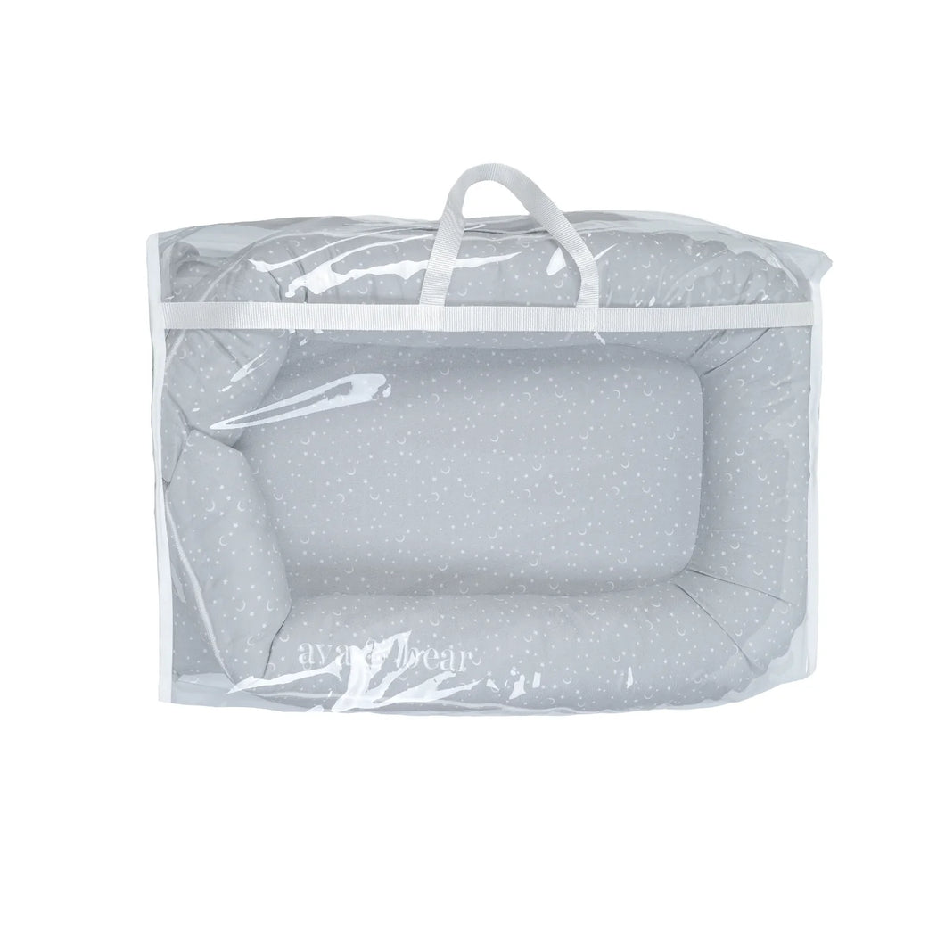 Our lounging pod is designed to provide a spacious yet snug area for your little one, ensuring comfort during tummy time, nappy changes, and supervised play. Its compact size makes it easy to use at home or on the go, offering a versatile and practical solution for modern parents.