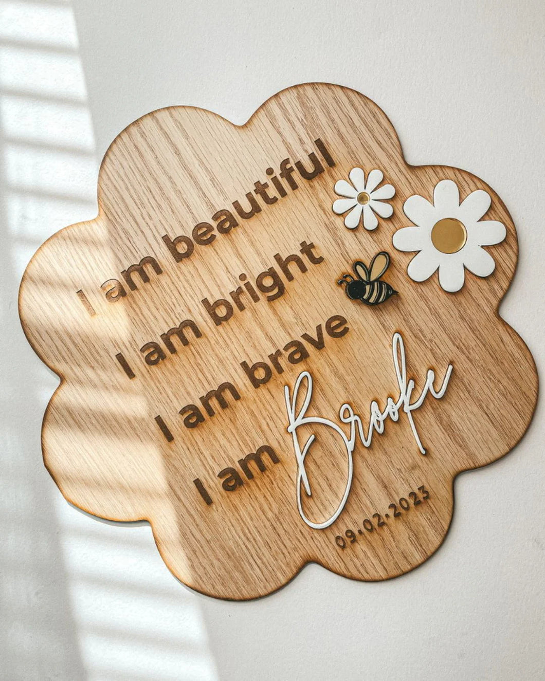 Introducing our Affirmation Wood Plaque—a heartwarming addition to any child's space. Crafted from quality wood, the child's name is delicately cut from white acrylic, creating a charming 3D effect. This personalized touch adds a special dimension to the positive affirmations featured on the plaque. A meaningful and inspiring decor piece for your little one's room, encouraging a daily dose of positivity. Embrace the uplifting spirit—order your Affirmation Wood Plaque today!