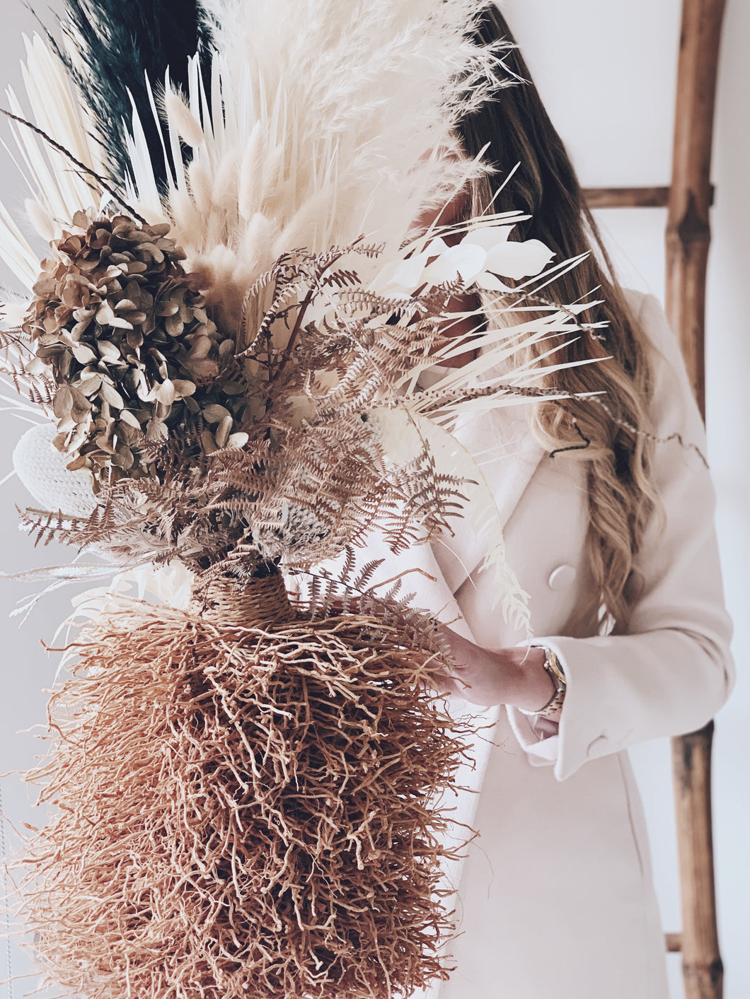 Our DIY Bespoke BC Arrangement comes with a Full Bespoke BC Bunch which includes a Banksia and Hydrangea, as well as our Bird Nest Vase. It is made up to be a timeless arrangement of natural earthy tones mixed with a black accent, made up of a few of our all time faves, including pampas grass, bunnytails, ruscus, fern and fan palms.