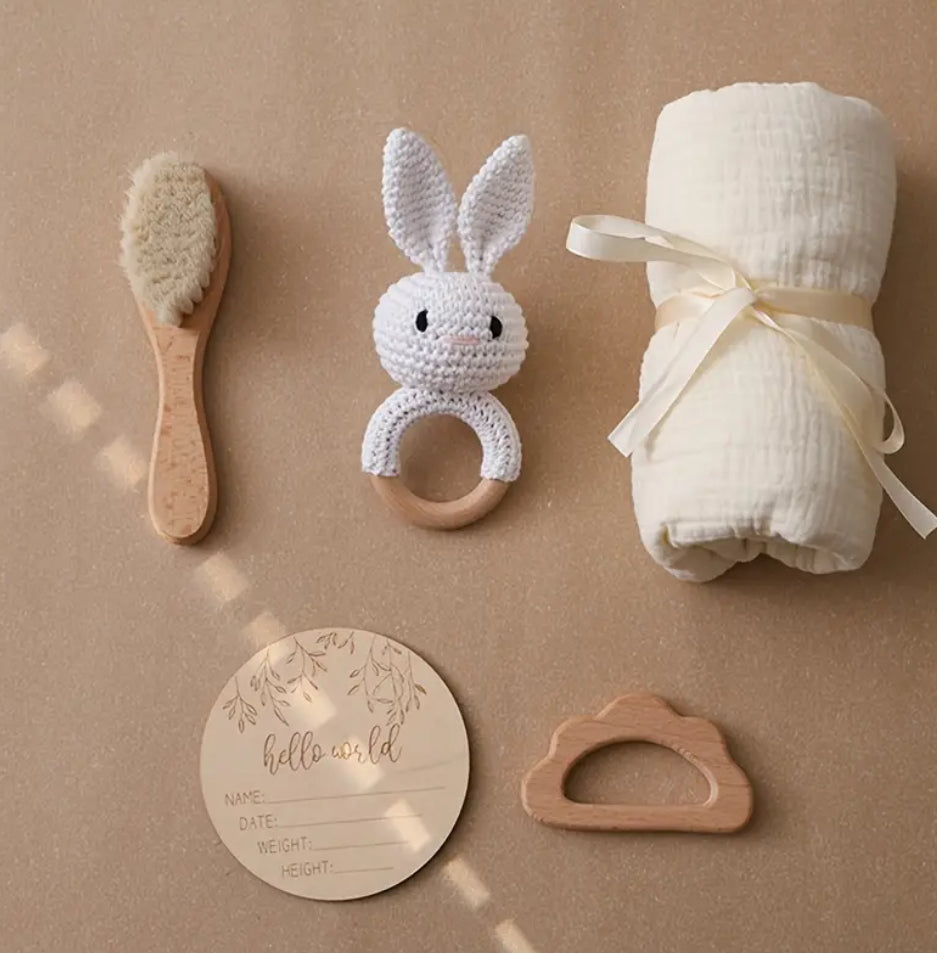 Our specially put together newborn gift set comes with a Wooden Baby Hair Brush, a White Bunny Rattle, a Wooden Cloud Teether, a ‘Hello World’ Announcement Disc, and an Ivory Muslin Swaddle Blanket.