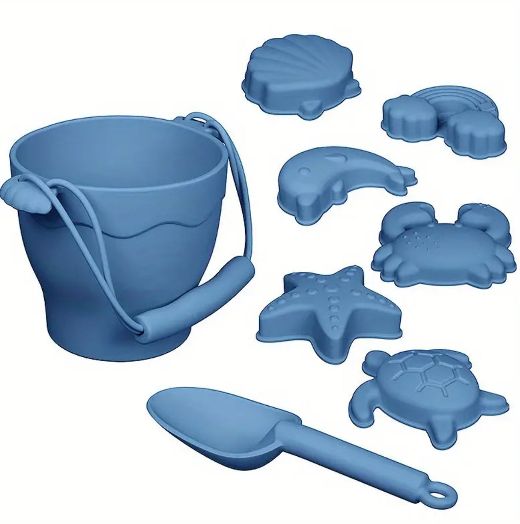 This silicone beach playset is perfect for your little ones to enjoy at the beach or to play with in the sand pit in the back yard. The set includes a bucket with handle, a spade and 6 silicone moulds.