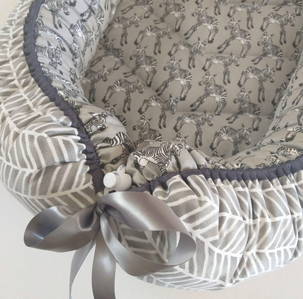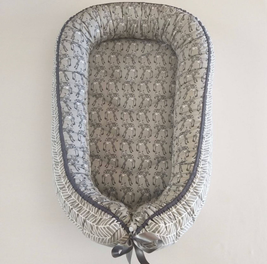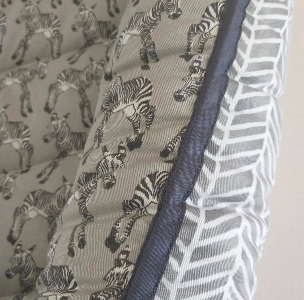 This handmade Babynest features an adorable print of baby Zebras on grey, paired with a grey herringbone and finished off with a plain grey trim. All pure cotton and fully reversible. Perfect for your little one’s wild African themed nursery. Great as a unisex or gender neutral option. Hollowfibre fill, removable satin ribbon, and adjustable drawstring with removable cord stopper. This is a complete product, meaning the mattress is quilted into place, and there is no removable cover. The entire Babynest goes into the washing machine.