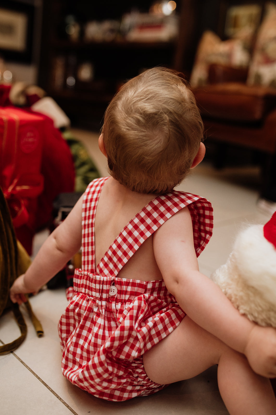 Our precious little model York is wearing his Baby Christmas Gingham Romper.