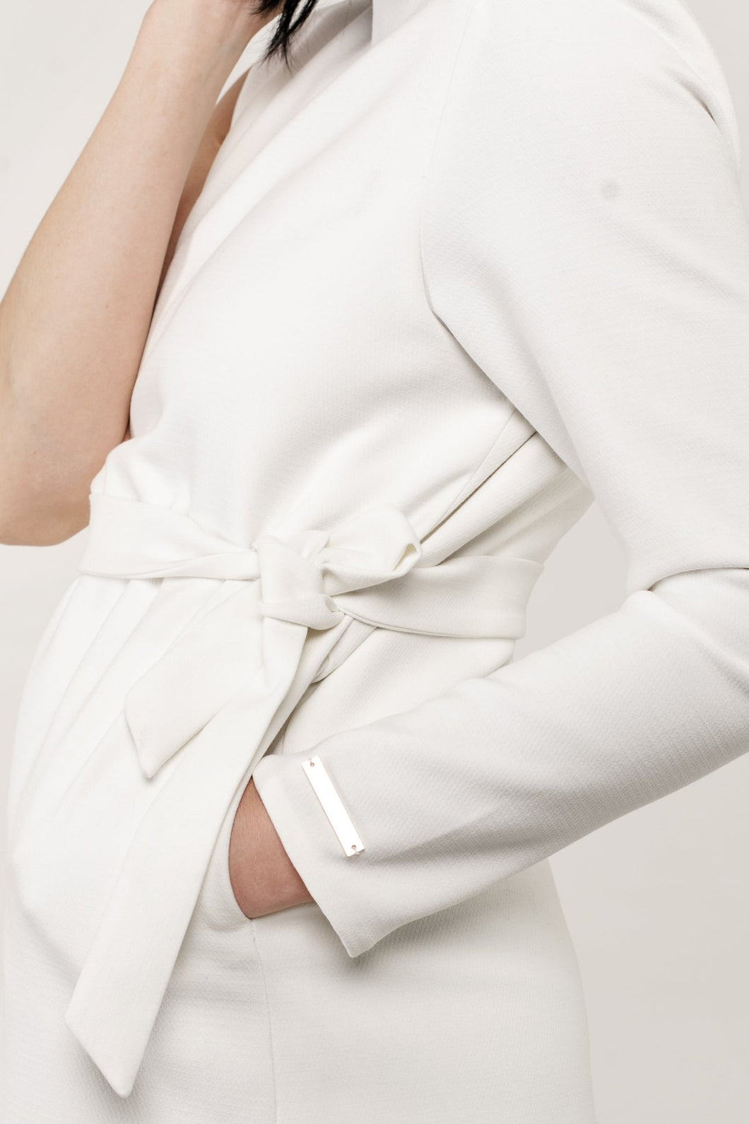 This unique jacket, made from the finest imported Italian fabric, was designed to be worn before, during and after pregnancy. The jacket opens on the side to function as a nursing cover and has a gold metal zip at the back for easy access. The belt was designed to either be tied around the waist or to the side. A Gold metal plate on the sleeve leaves this minimal jacket with just the perfect touch of elegance. To be used as a stylish nursing jacket, whether you are a working mom or a mom on-the-go.
